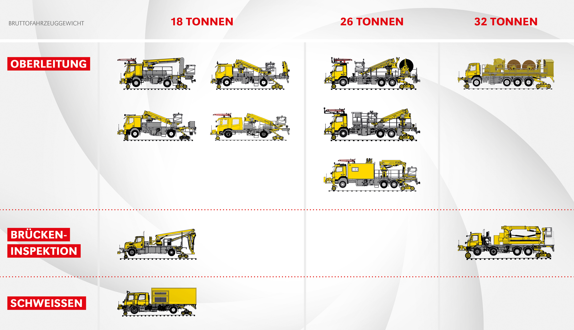 Goldschmidt bietet ein breites Spektrum an leistungsstarken Zweiwegefahrzeugen für eine Vielzahl von Wartungs-, Bau- und Inspektionsaufgaben im Gleisbereich. Unser Portfolio umfasst Oberleitungsfahrzeuge, Tunnel- und Brückeninspektionsfahrzeuge, Kranfahrzeuge, Schweißfahrzeuge und weitere maßgeschneiderte Lösungen für effiziente und zuverlässige Arbeiten an Ihrer Bahninfrastruktur.