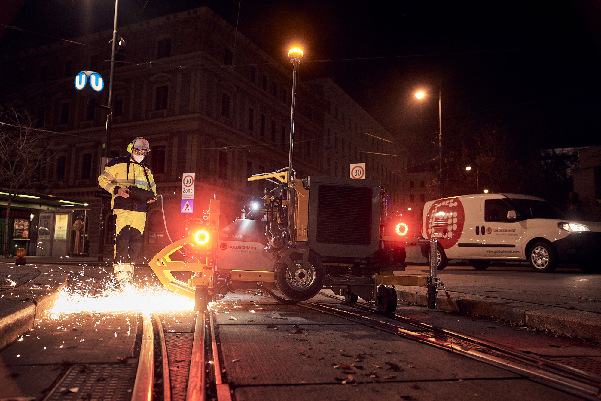 The grinding machine enables the grinding of the running surface of rails, corrugation grinding and particularly the cost-effective maintenance of bottlenecks such as switches in railway stations, where large-scale grinding vehicles cannot be used. The machine offers the best power / weight ratio on the market and allows in combination with the Railshape Eco and advanced metrology an innovative and highly efficient grinding solution whereby the complete rail or switch can be repaired.
